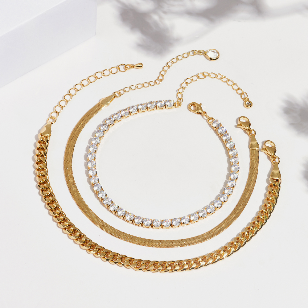 This is a simple and elegant bracelet set, including a Snake Chain, Diamond Anklets, and Cuban Chains, which are all fashionable and will never out of style. Each bracelet can be worn together or separately to match your dress.
