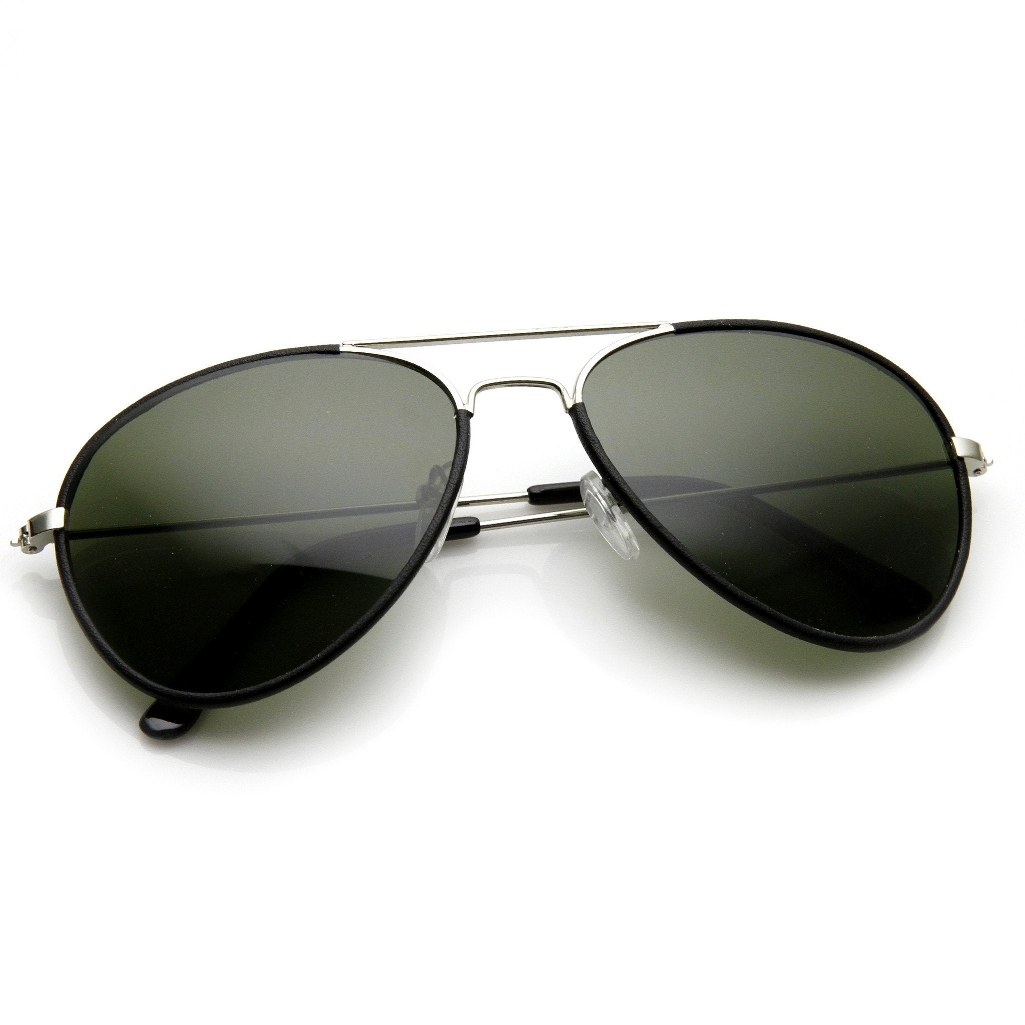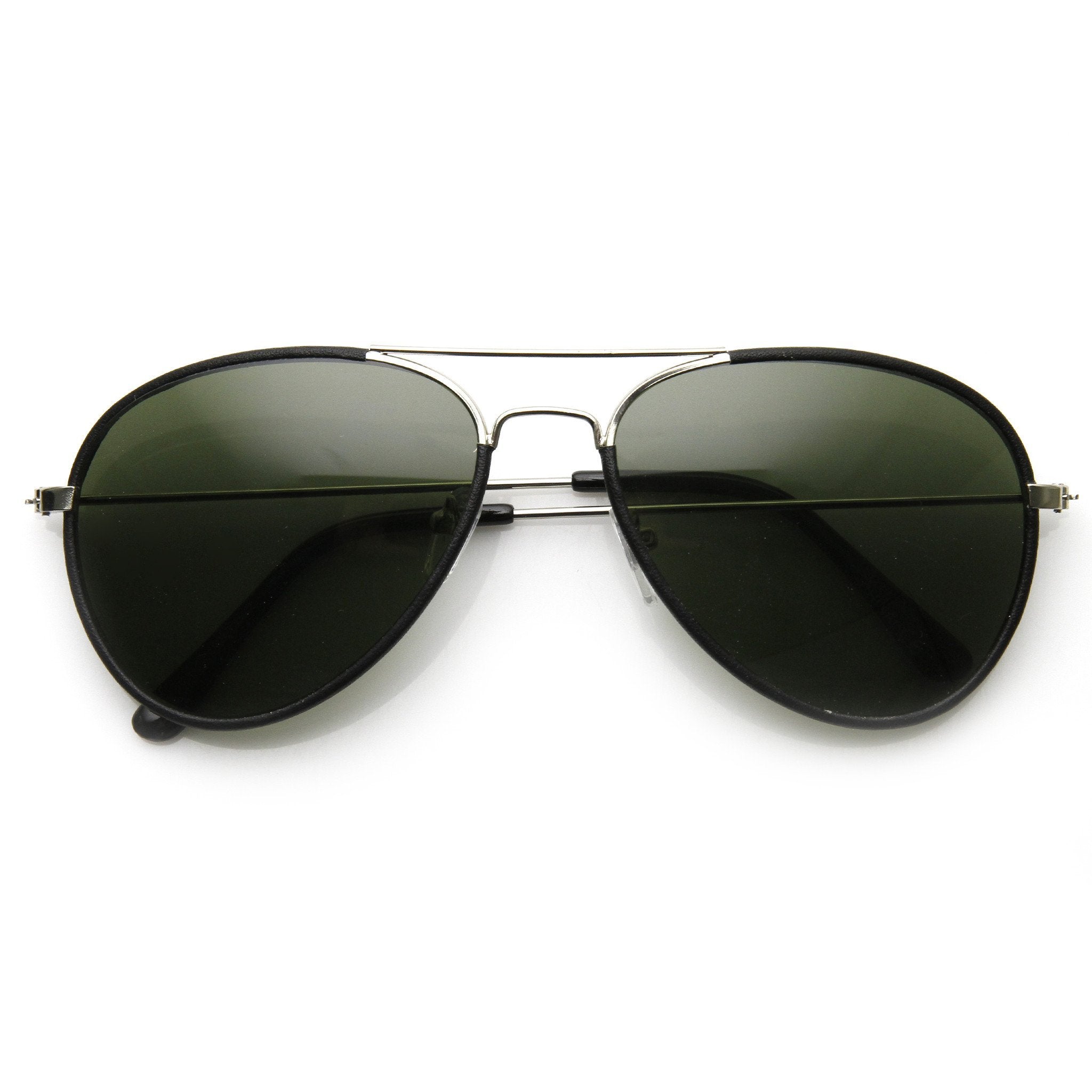 Teardrop metal aviator that features an elegant faux leather two-tone colored frame. A classic frame that offers a very timeless and stylish look all season long. Made with a metal based frame, metal hinges and UV400 protected polycarbonate lens.