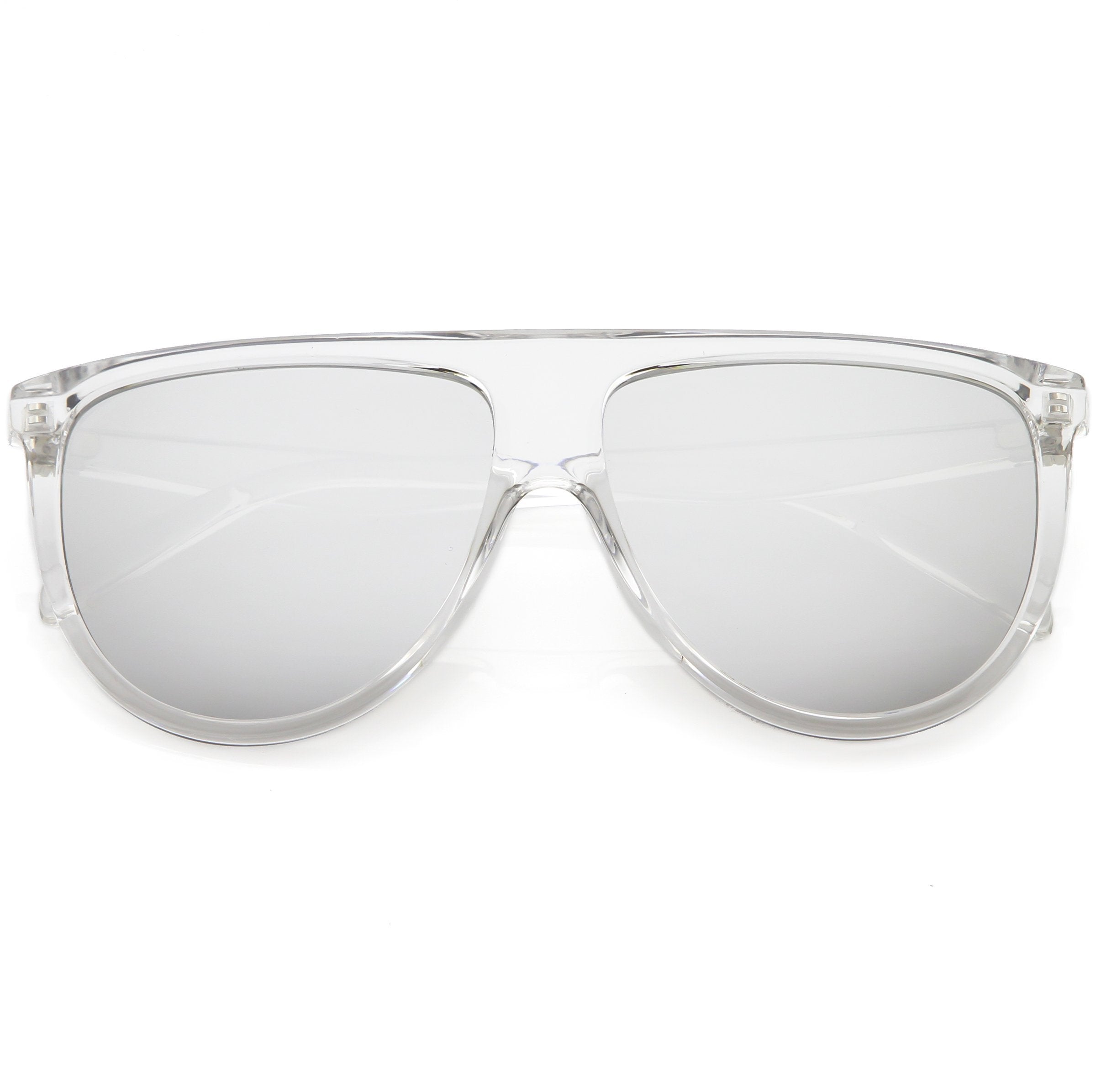 Choose between five different colors of these modern oversize aviator sunglasses. This stylish flat top style is the perfect go-to accessory for any kind of outfit. Designed with a mirrored teardrop flat lens to give it a sleek look. Finished with a plastic based frame, metal hinges, and 100% UV protected lenses.